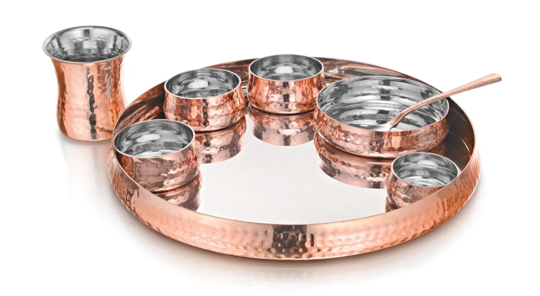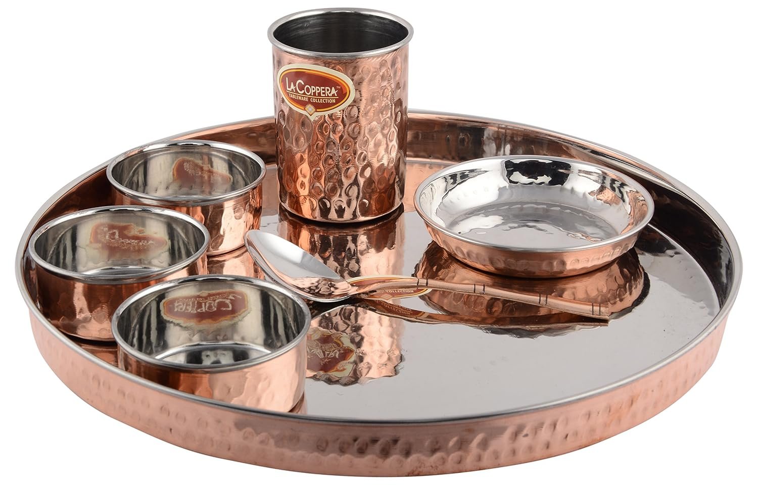 LP 100% Pure Copper Stainless Steel Sovereign Thali Set Hammer – Big – 8 Pcs Set – Copperware Dinnnerware for Home, Restaurant